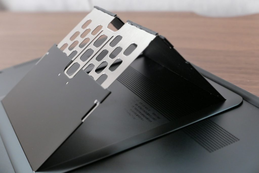 自分は非常に薄型で直接貼り付けるタイプの金属製スタンド「Kopek majextand」を使用していて、こちらがあることで排気効率低下を回避しています。キーボードにそれなりに確度がつくことになるので、入力のしやすさもアップしますのでお勧めです。