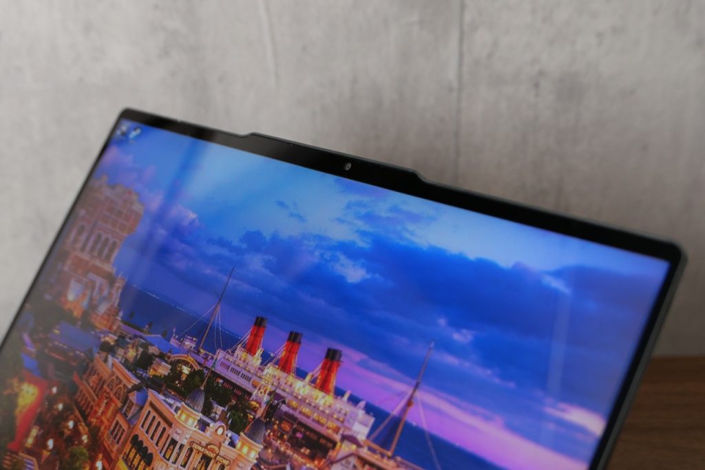 天板部分には突起があり、こちらには型番ロゴと共に裏面にはWebカメラとステレオマイクを搭載。Macbookのようなノッチ方式ではなく、四角いディスプレイを維持したうえでのこの仕様は個人的には非常に歓迎します。Webカメラの性能もかなり高く、ビジネス用途で不満を持つことは無いでしょう。