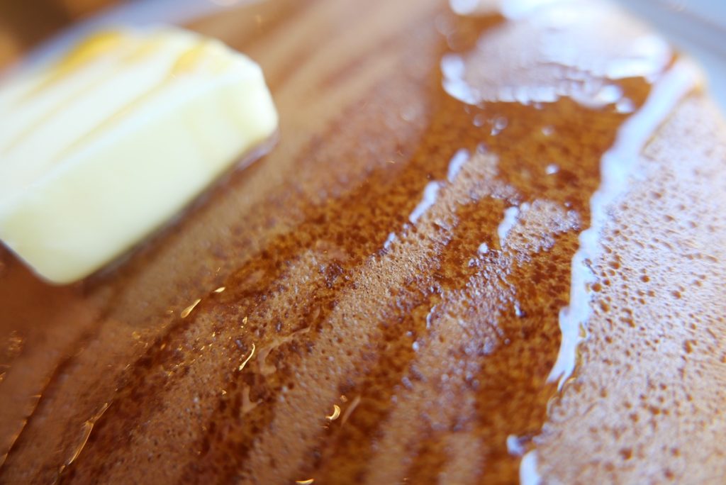 こちらはパンケーキに寄った場合です。前ぼけ、背景ぼけの両方があってパンケーキを強調した写真になってはいますが、丸いパンケーキに歪みが発生してパンケーキの形が不自然になっていますね。