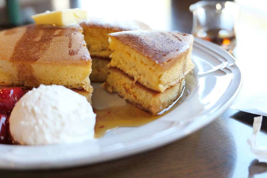例えばこのように、写真の主役をパンケーキではなく「パンケーキの断面」とすることで歪みを上手に使って断面を強調するように撮影すると、広角の良さが出ると思います。