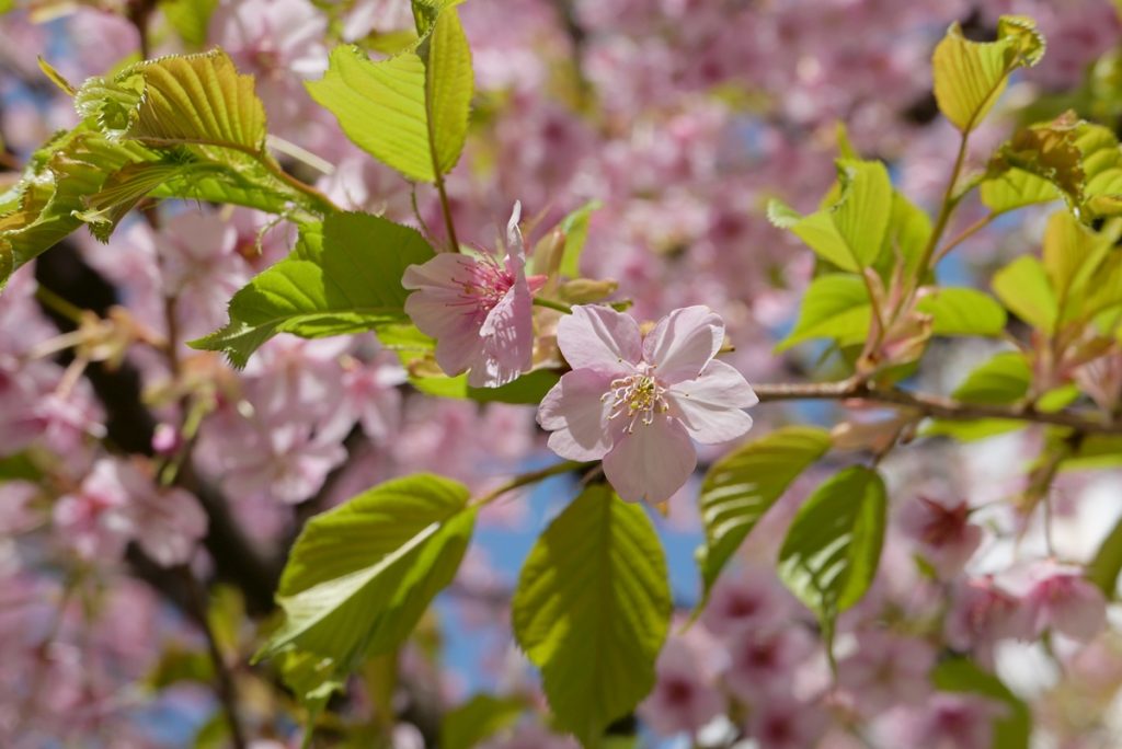 木の枝や葉を主役に捉えると、桜の花が際立って見えますね。