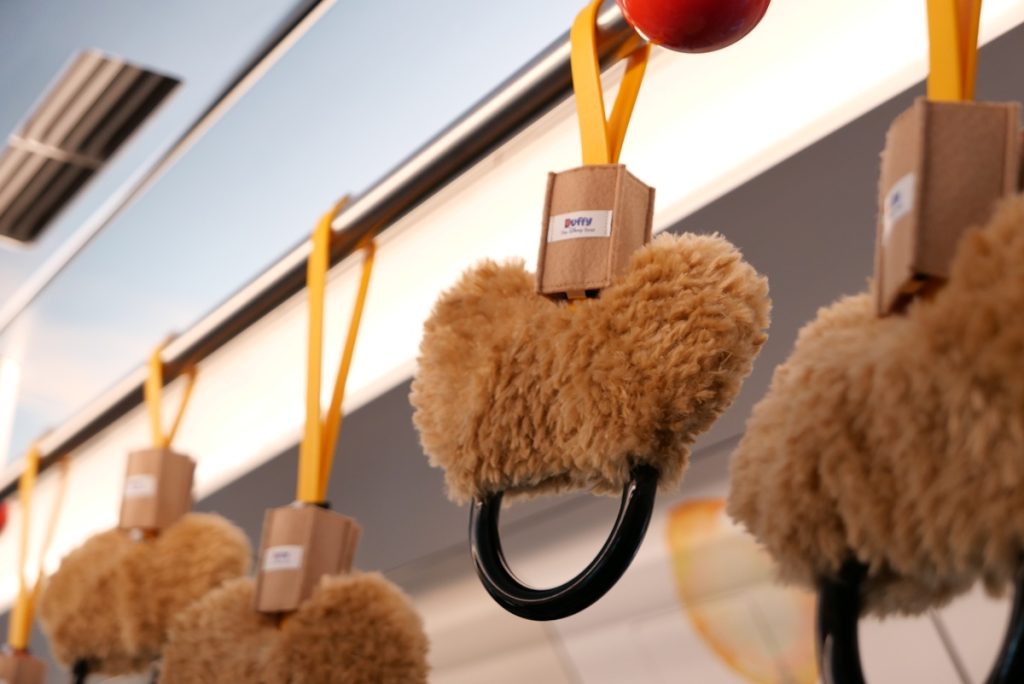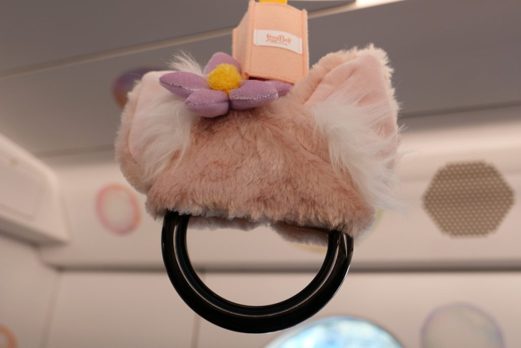 こちらは番外編、東京ディズニーシーで開催中の「カラフルハピネス」の特別仕様のディズニーリゾートラインの車内です。つり革に各キャラクターがデザインされています。