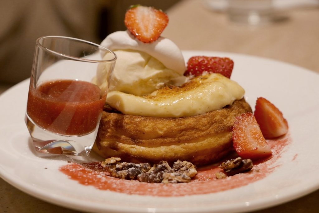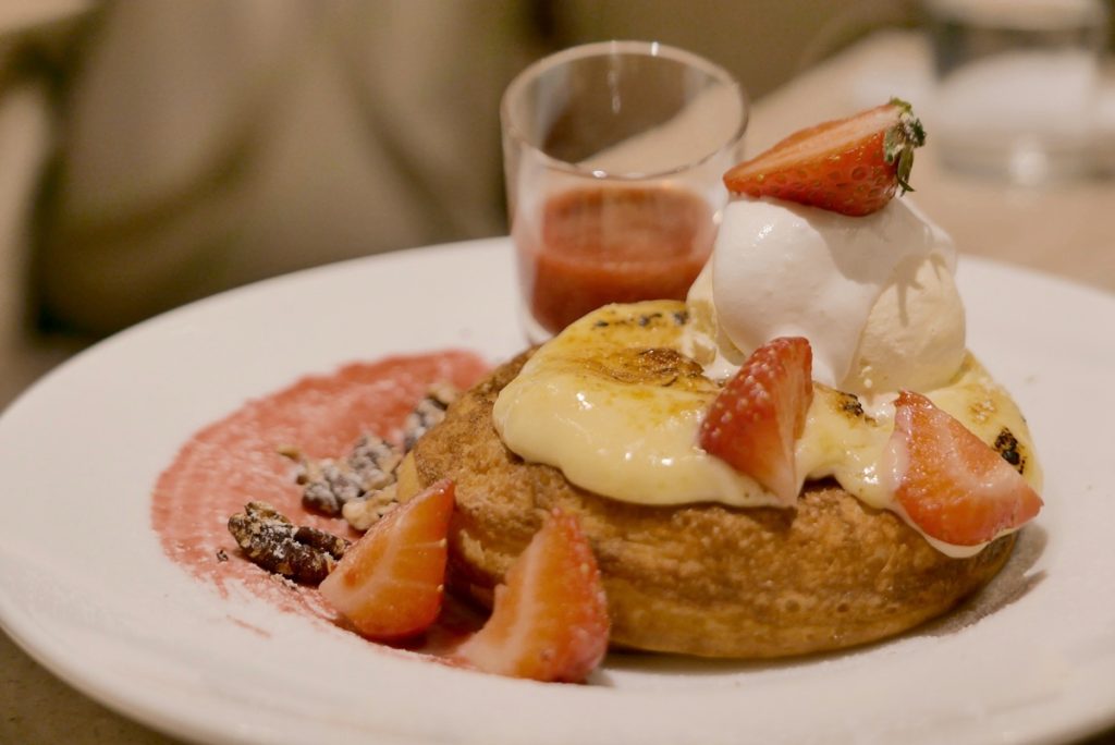「焦がしブリュレのパンケーキいちごソース」。パイと使われている食材はほぼ同じですが、濃厚ないちごソースが添えられていて、また違った雰囲気になります。