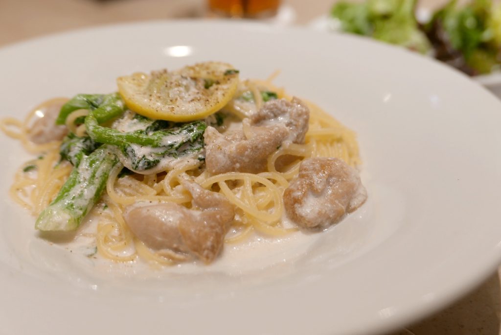 「若鳥と菜の花の自家製塩レモンクリームパスタ」はとても彩りが綺麗です。