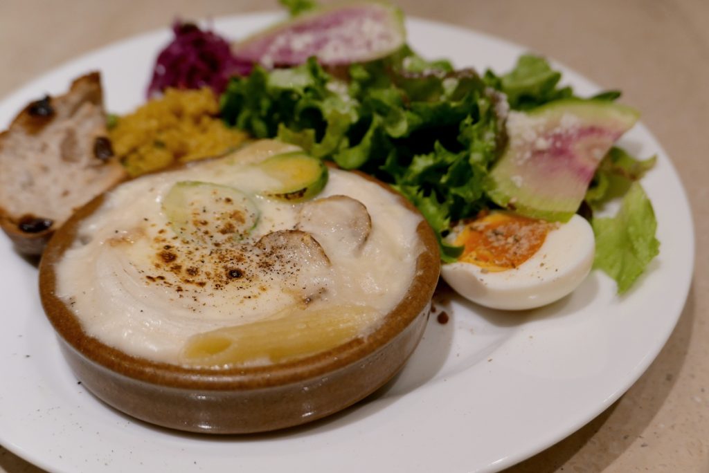 「ベビーホタテと芽キャベツ、新玉ねぎのホワイトジンジャーグラタン」は付け合わせも含めて本当に鮮やか。ボリュームもたっぷりですね。