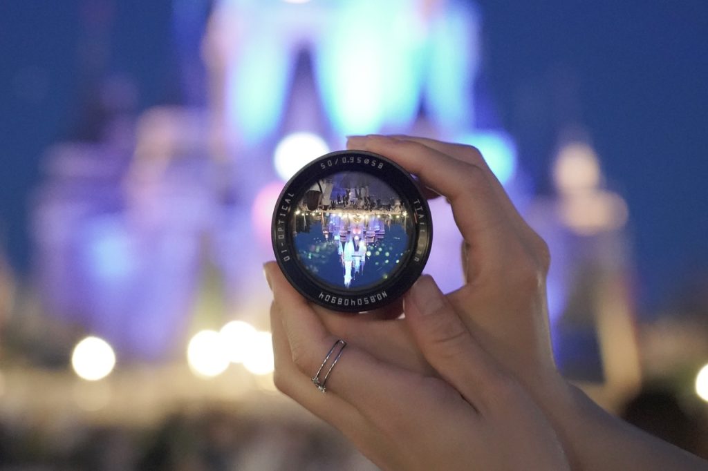 F0.95という大口径のため、絞りを開放にした場合には鏡筒全体が開き美しく背景を映し出します。よく水晶玉とかでやる技法ですが、レンズ越しにそれができるのでこのレンズそのものが被写体として映えてきます。シンデレラ城前でレンズを覗き込んではしゃいでいる様は異様だったかもしれませんが、この写真すごいですよね。